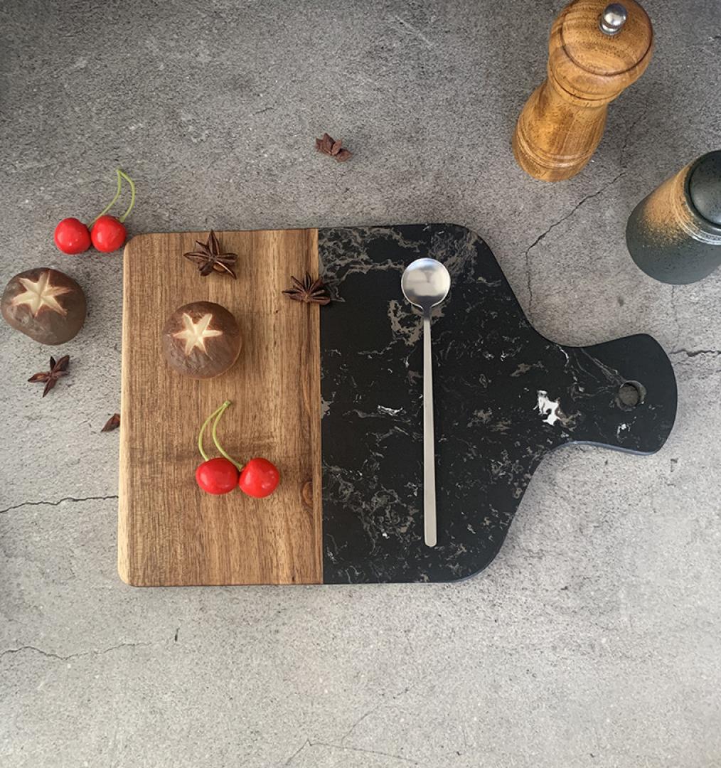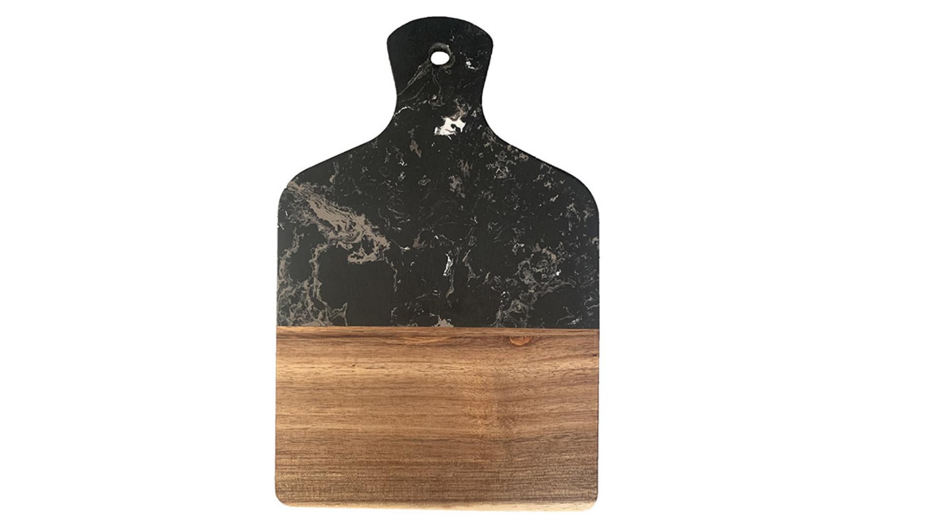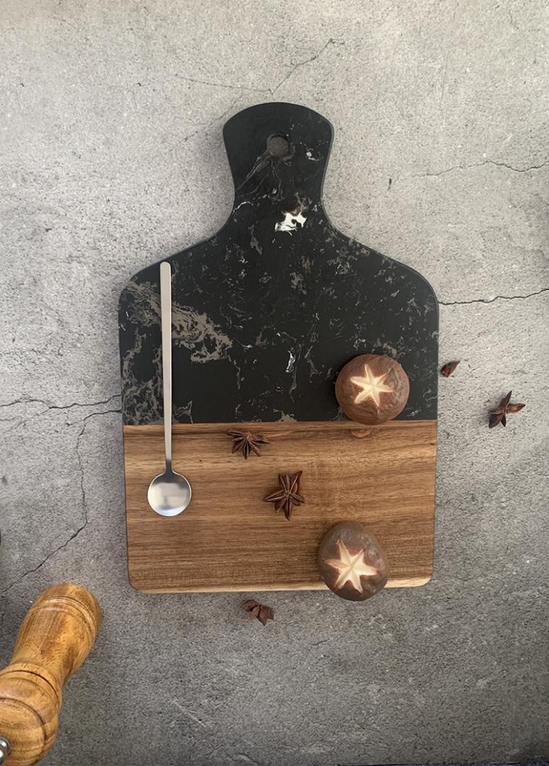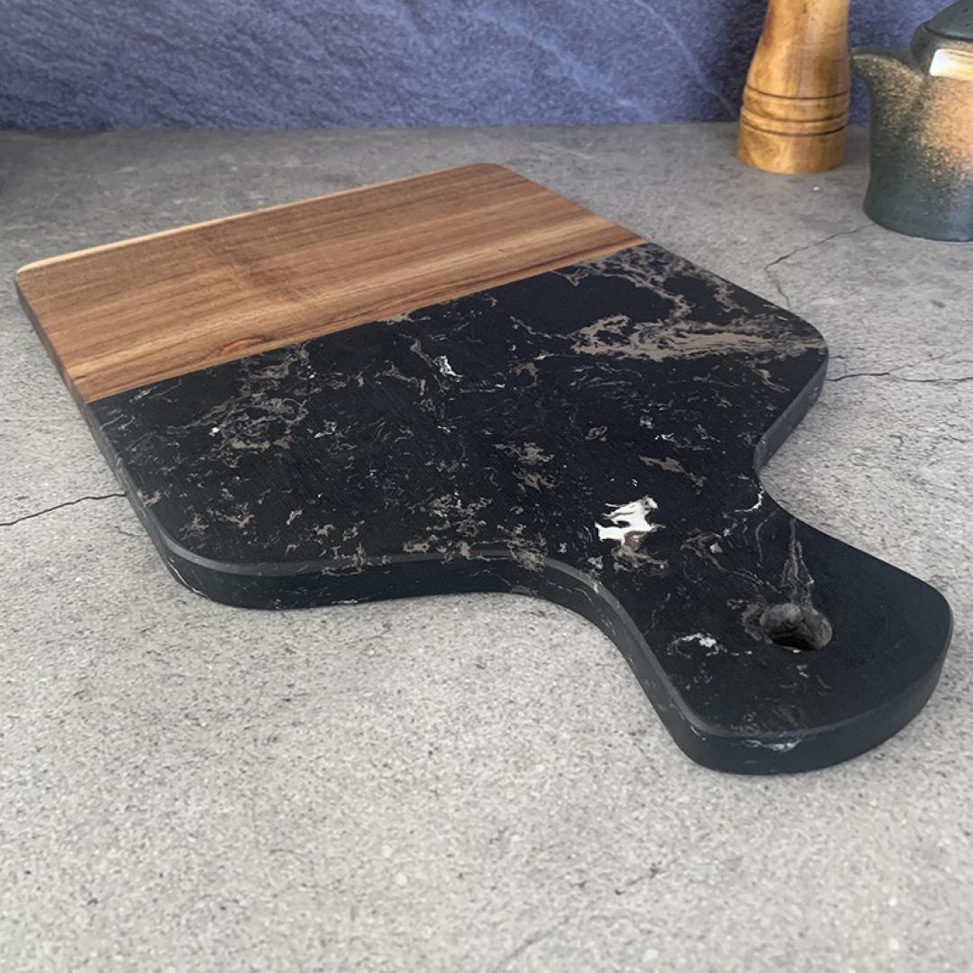 Ova ručno izrađena daskica predstavlja savršen spoj topline prirodnog drva i profinjenog crnog kamena s unikatnim mramornim uzorkom. Svaki komad je poseban – nijedna daska nije potpuno ista, što je čini jedinstvenim dodatkom svakoj kuhinji.