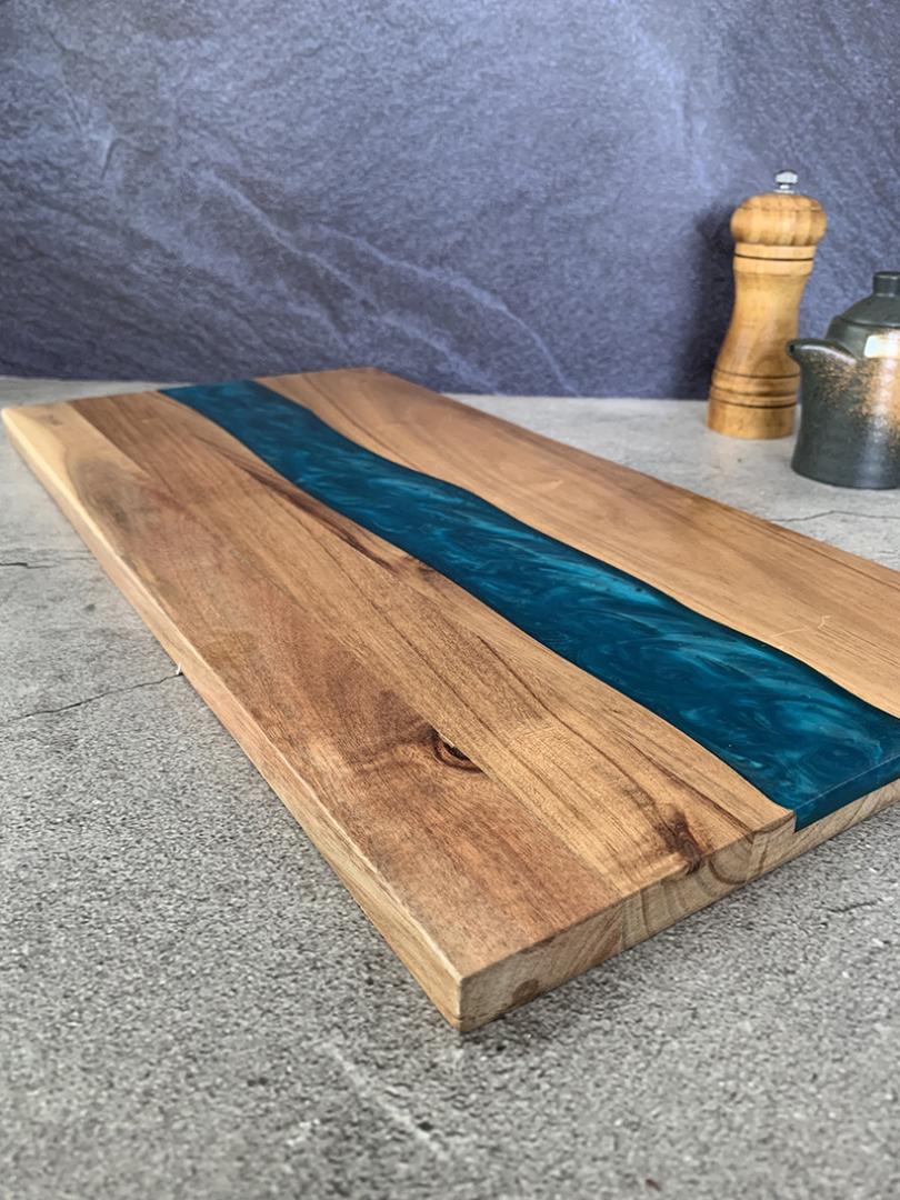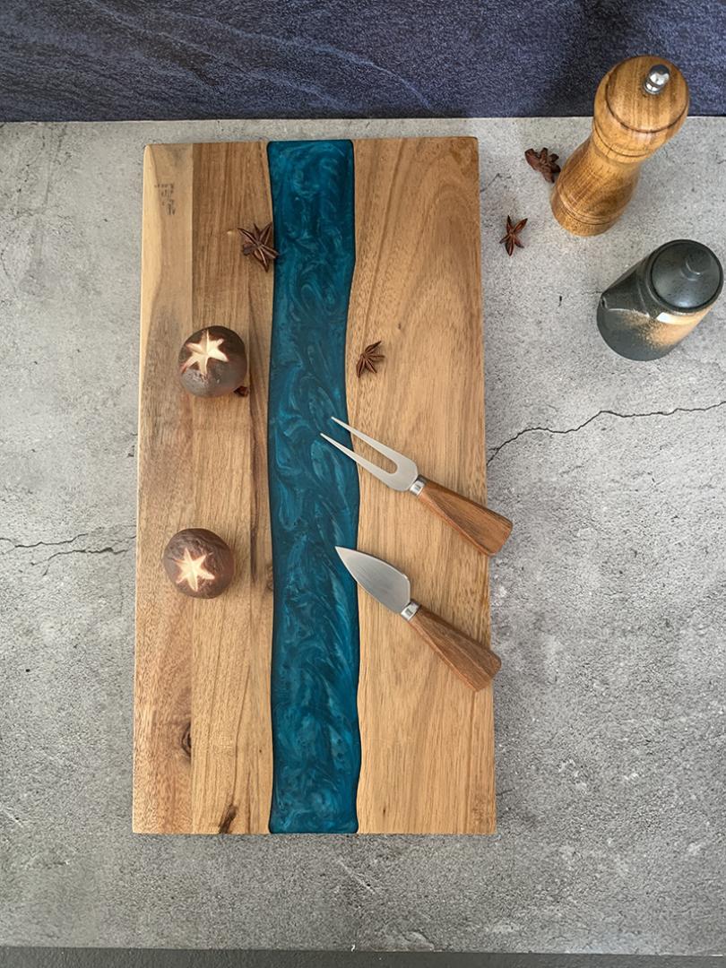 Natura Blu ("plava priroda") – daska koja spaja prirodnu toplinu drva i dubinu plavog epoksida. Ručno izrađena, svaka daska je unikat – idealna za posluživanje sireva, predjela ili kao dekorativni dodatak vašoj kuhinji.