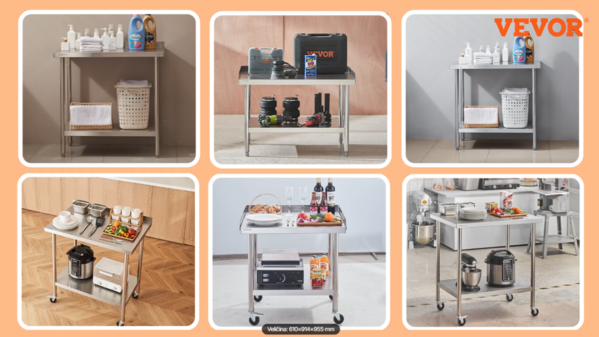 - Svestrana primjena: Osim za pohranu, naš stol može se koristiti za sjeckanje povrća, mijesenje tijesta, rezanje mesa i druge kuhinjske zadatke. Savršen je za korištenje u barovima, restoranima, hotelima, bifeima, catering događajima, školskim aktivnostima ili uredskim sobama za odmor.