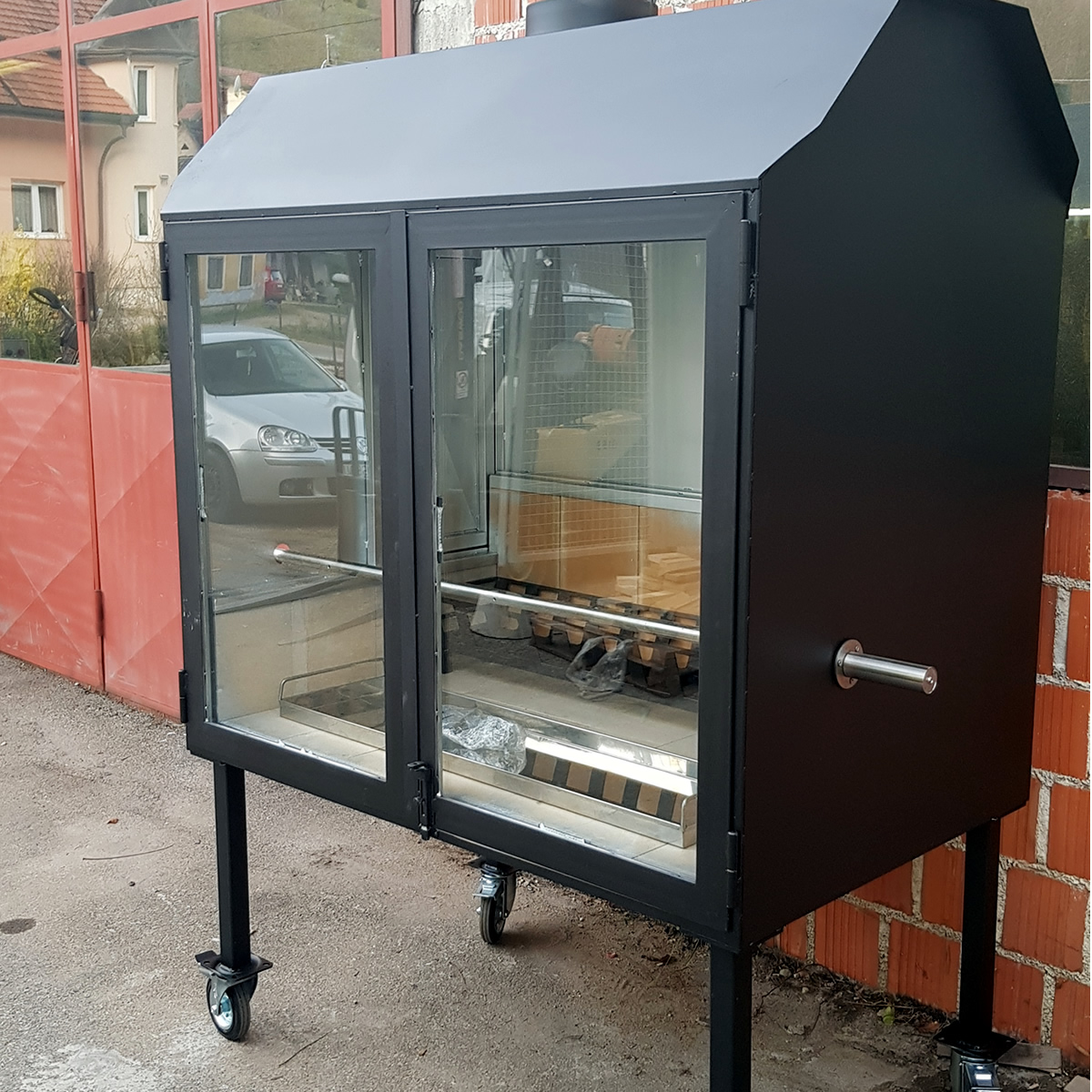 Željezna konstrukcija sa vratima na dva krila. Na 4 kotača.