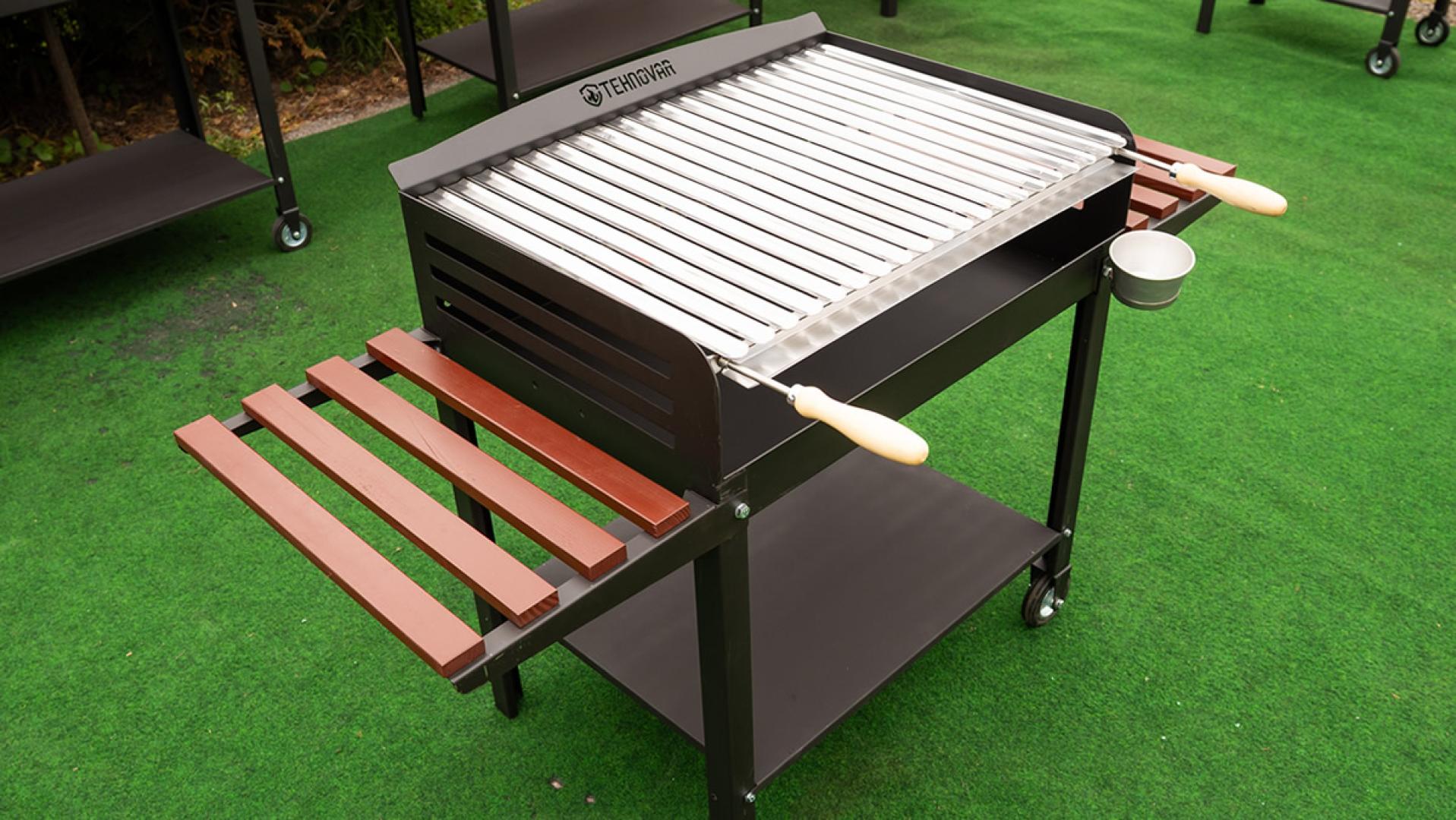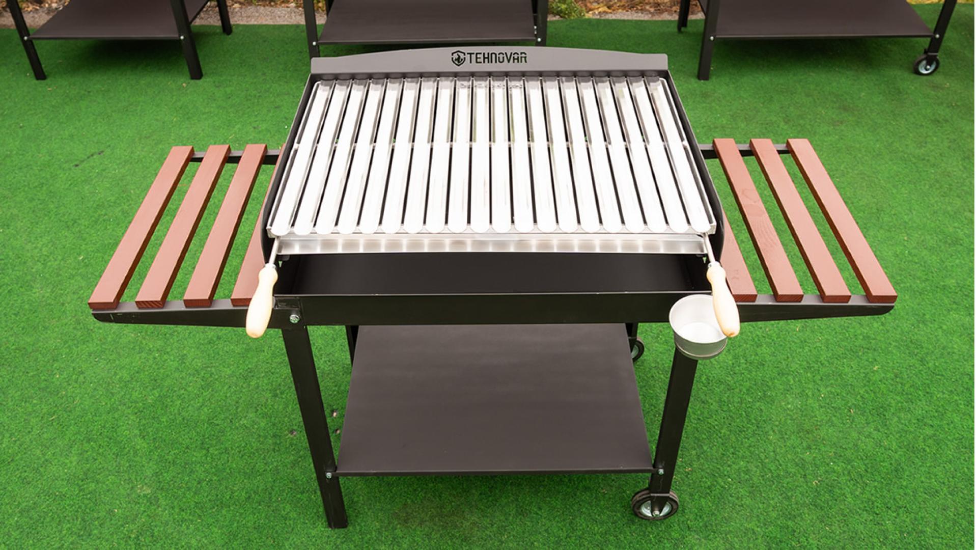 Roštilj TEHNOVAR - ložište sa kotačićima i bočne police od drvenih letvica. Dimenzije roštilja – površine za pečenje – 40x60 cm.