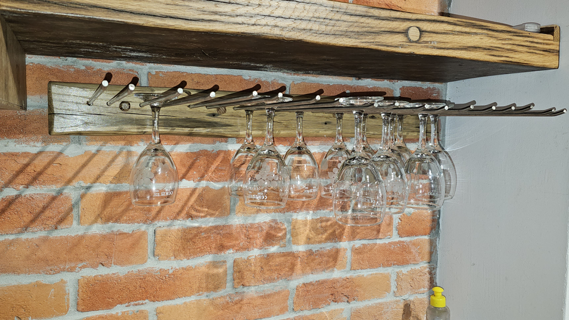 Inox stalak za čaše obučen u drvenu oblogu. Zidni model za 32 čaše. Nosač se montira u zid i fiksno stoji.